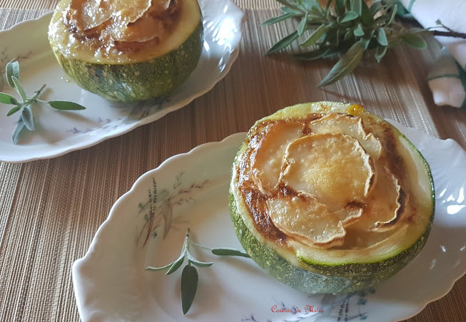 6. Rellenamos cada calabacín con el sofrito de panceta, cubrimos con las rebanadas de queso y horneamos 40 minutos, servimos  caliente adornado con unas horitas de salvia.
